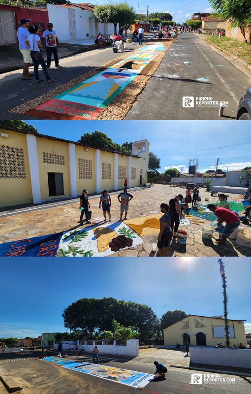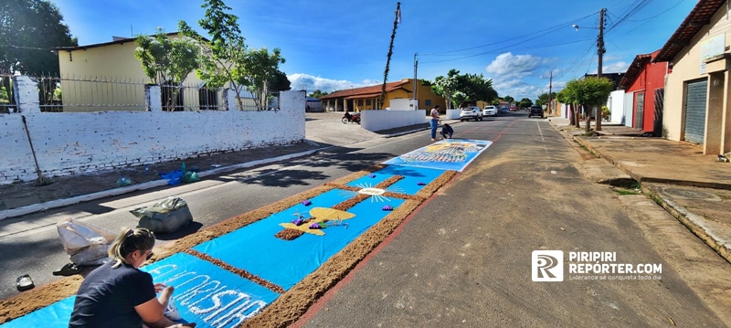 Na manhã desta quinta-feira (03), moradores de comunidades e membros de escolas se uniram para produzir tapetes com desenhos alusivos ao Dia de Corpus Christi. A ação, que faz parte da programação das Paróquias Sagrado Coração de Jesus e Nossa Senhora dos Remédios, ocorre ao longo da Avenida Embaixatriz Madalena Resende.