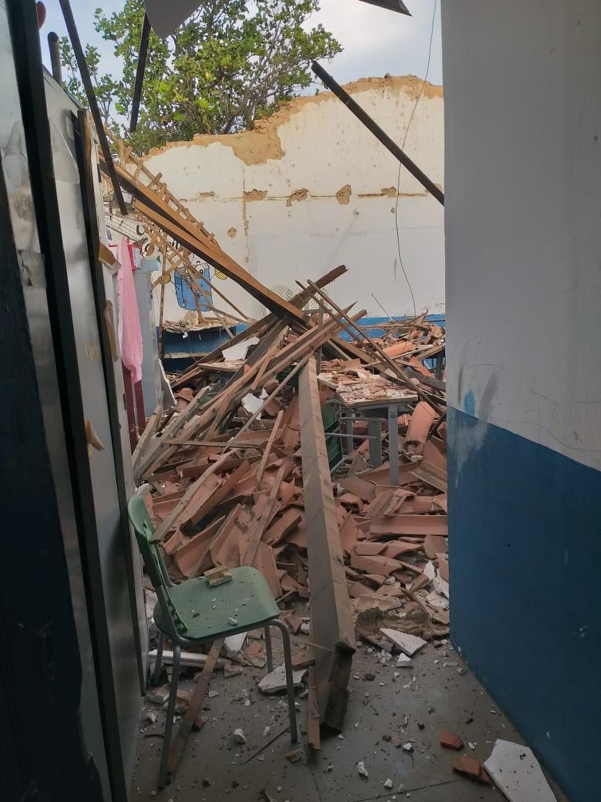 Parte do teto da escola Américo Melo Castelo Branco, localizada na Fazenda Abelheirinhas, zona rural de Jatobá do Piauí, veio abaixo na tarde desta quarta-feira (19), deixando muitos destroços espalhados nas dependências da unidade.