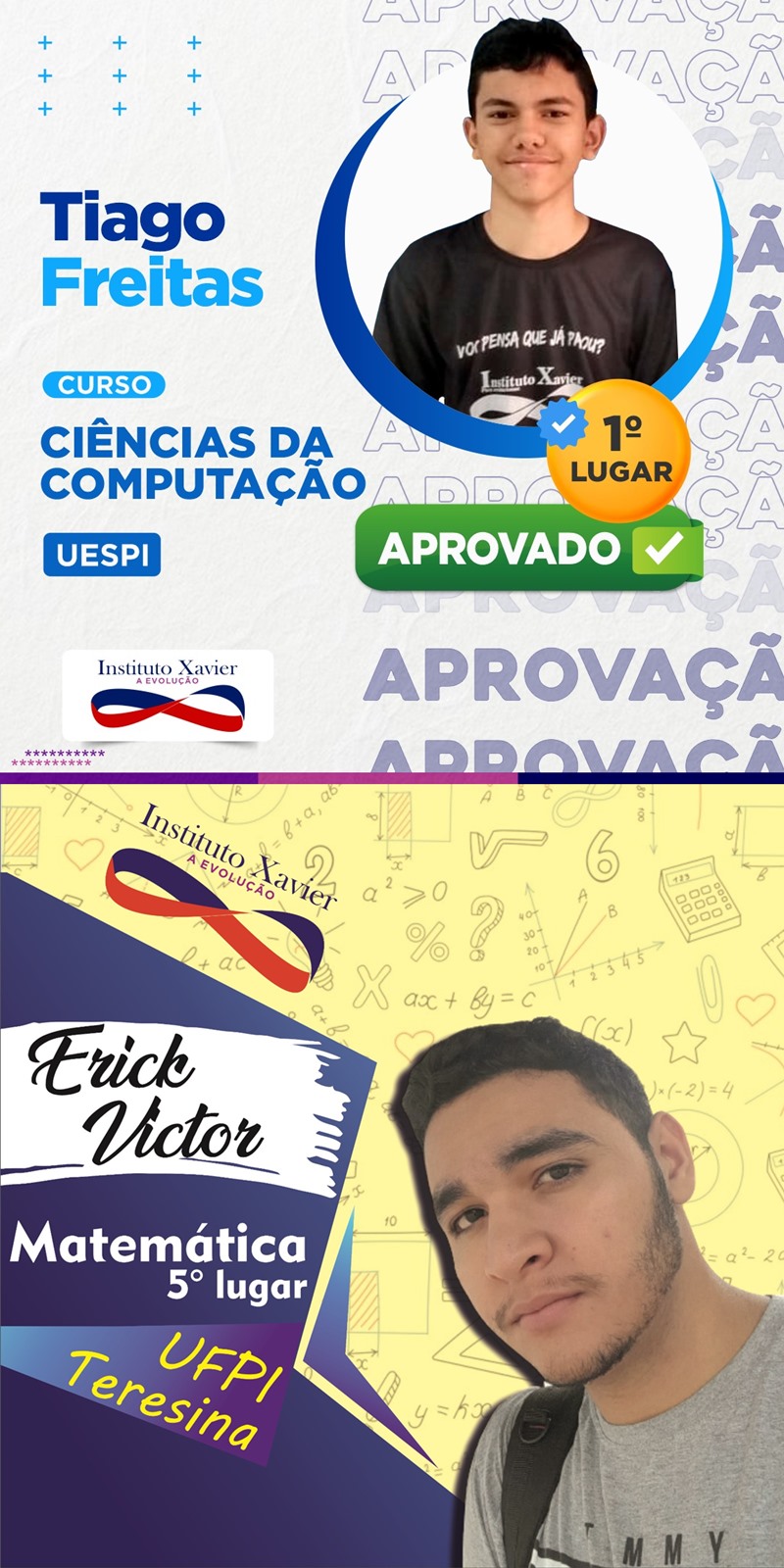 “Nossos queridos alunos agora são aprovados em 5° lugar para Bacharelado em Matemática, na UFPI, em TERESINA, e 1° lugar para Ciências da Computação, na UESPI, em Piripiri. A família Instituto Xavier muito se alegra com o foco, compromisso e aprovação de todos”, detalha e comemora o instituto.