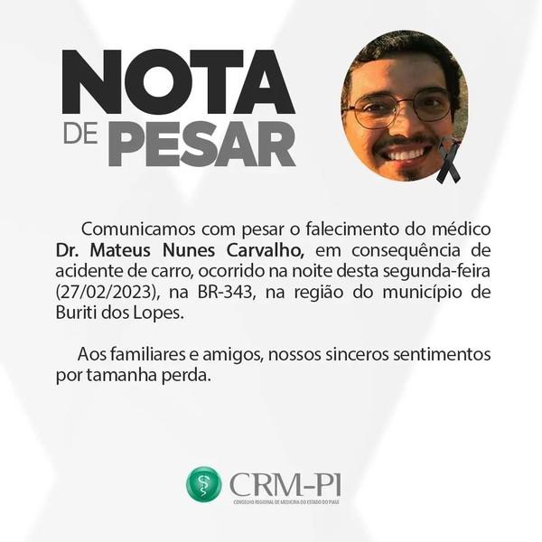 O médico Mateus Nunes Carvalho, de 28 anos, morreu na noite dessa segunda-feira (27), em um grave acidente na BR-343, em Buriti dos Lopes, município 280 km ao Norte de Teresina. Segundo a Polícia Rodoviária Federal, o jovem estava na companhia do pai quando perdeu o controle do carro que dirigia.