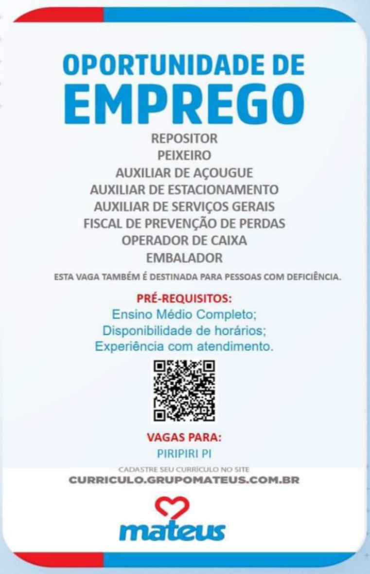 O Mateus Supermercado de Piripiri está com oportunidade de emprego. São 8 funções para seleção de candidatos.