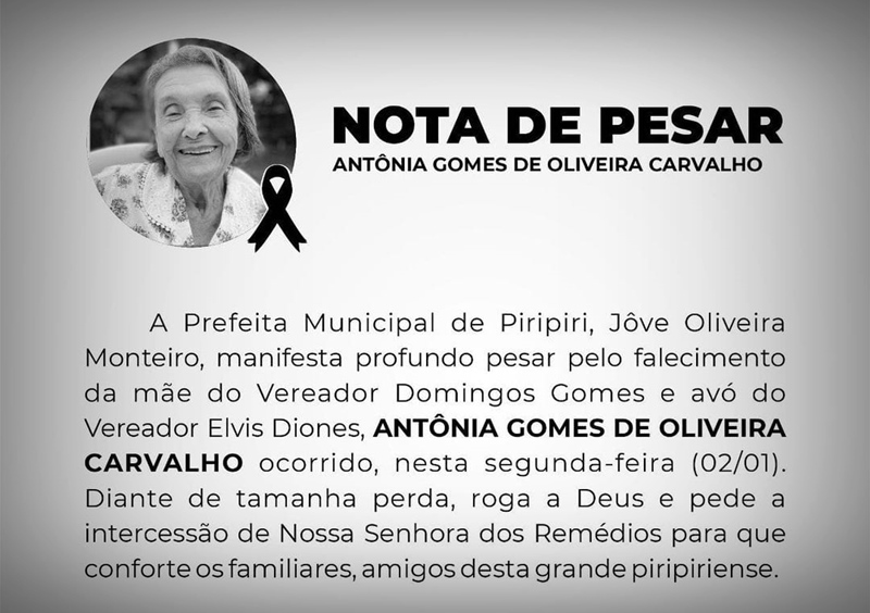 Falaceu em Pirirpiri dona Antônia Gomes, mãe do vereador Domingão e avó do vereador Elvis Diones. A prefeita do município, Jôve Oliveira, emitiu Nota de Pesar: