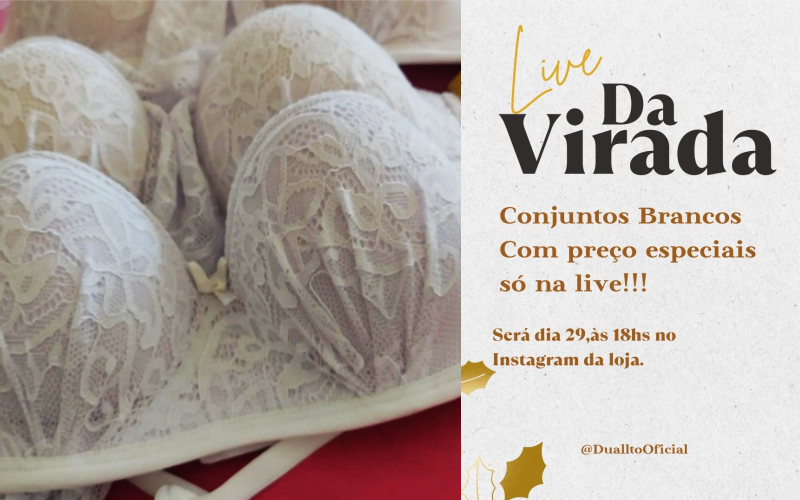 A Duallto Moda Íntima estará fazendo uma live de promoções nesta quinta-feira (28). Serão ofertas conjuntos brancos com preços especiais, somente quem estiver no momento da live.