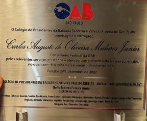 O Colégio de Presidentes da Baixada Santista e Vale do Ribeira de São Paulo homenageou na última sexta-feira (08/12), o Conselheiro Federal da OAB-PI, Carlos Augusto de Oliveira Medeiros Junior, pelos relevantes serviços prestados e atenção que é dispensada às Subseções.