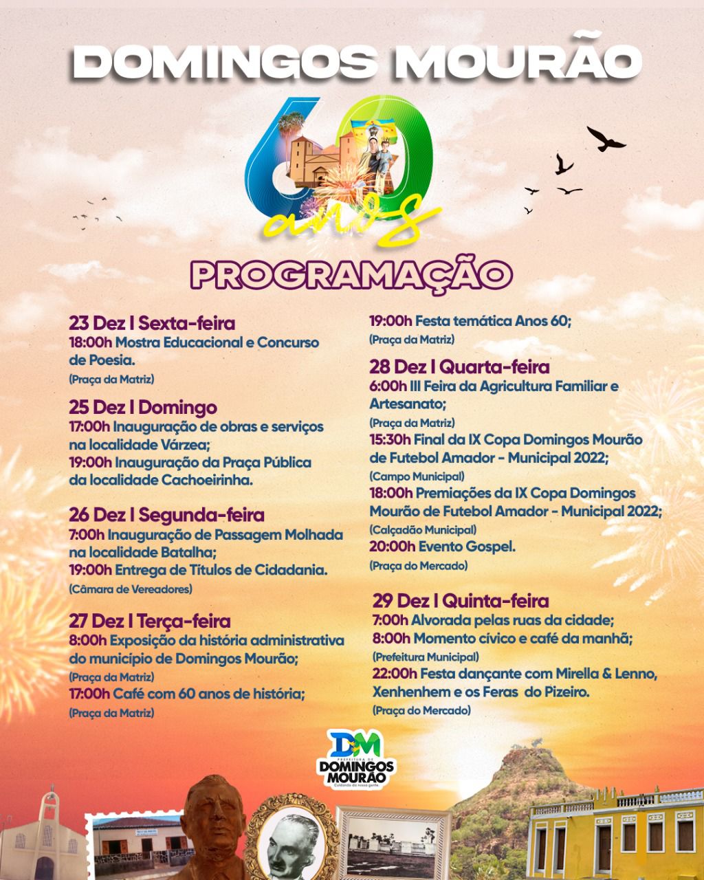 O município de Domingos Mourão irá celebrar 60 anos de emancipação política no dia 29 de dezembro e a prefeita Nelda Gomes juntamente com toda a sua equipe municipal, irá promover uma festa na praça pública da cidade. Terá Mirella e Lenno (ex-Desejo de Menina) e Xenhenhem!
