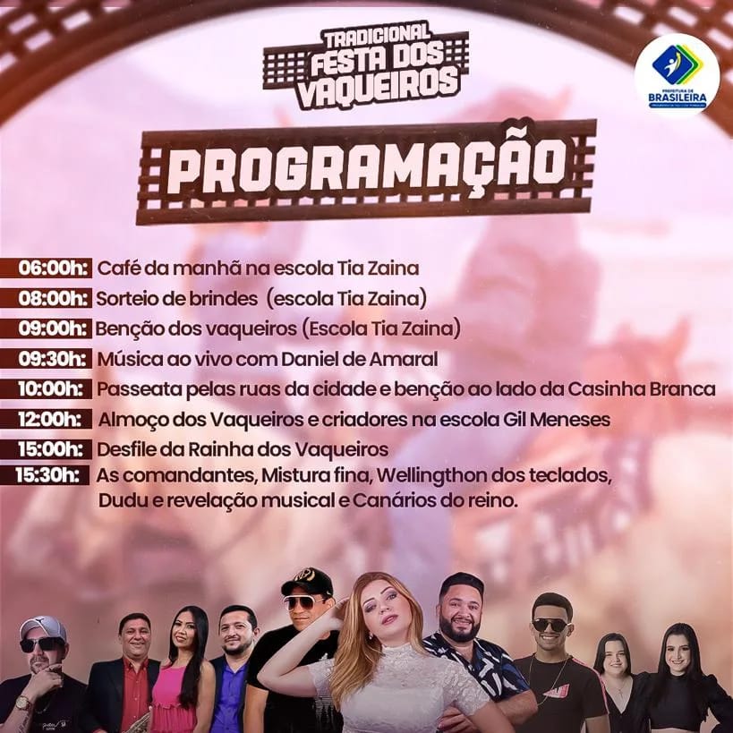 O município de Brasileira promove o tradicional concurso da Rainha dos Vaqueiros. A Festa dos Vaqueiros ocorre dia 7 de dezembro, dentro da programação dos Festejos de Brasileira; festa gratuita com Canários do Reino, As Comandantes, Dudu Revelação, Mistura Fina e Welligton dos Teclados!