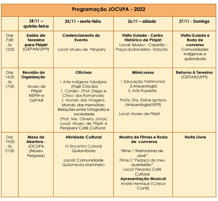 Será realizado no Museu de Perypery e no espaço Perypery Café Cultural, promovido pela GEPAR - Grupo de Educação Patrimonial e Arqueologia; juntamente com a Pró Reitoria de Extenção e Cultura (PREXC) e NEPIH– NÚCLEO DE PESQUISA E ESTUDO EM HISTÓRIA, CULTURA E SOCIEDADE DE PIRIPIRI.