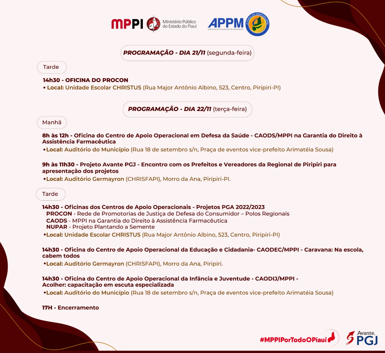 O Ministério Público do Estado do Piauí (MPPI) realizará, nos próximos dias 21 e 22 de novembro, uma programação com uma série de atividades junto a gestores municipais de Piripiri e região. A iniciativa faz parte do programa “MPPI Por Todo o Piauí”, que tem como uma de suas finalidades a apresentação aos chefes de órgãos públicos municipais a possibilidade de adesão aos projetos que formam o Plano Geral de Atuação (PGA) 2022-2023 do Ministério Público do Piauí (MPPI).