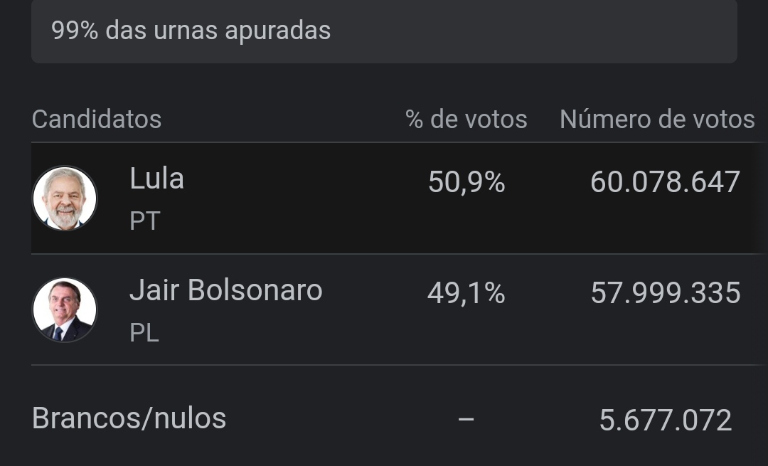 Àquela altura, Lula tinha 50,83% dos votos válidos e não poderia mais ser alcançado por Bolsonaro, que contabilizava os outros 49,17% de votos válidos.