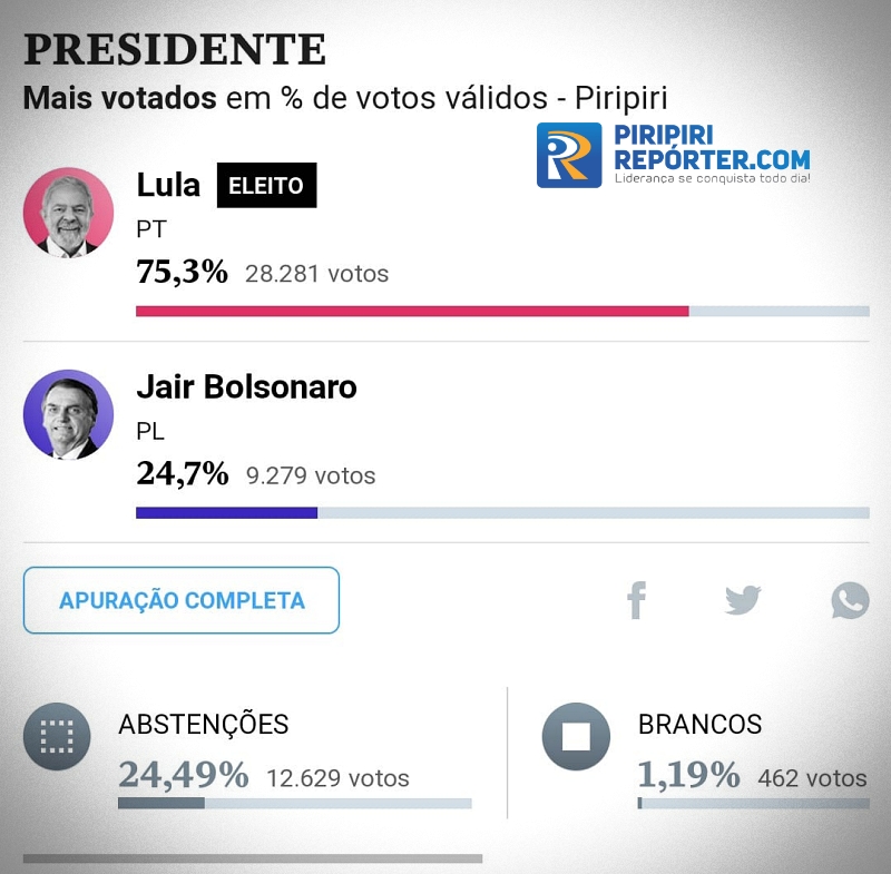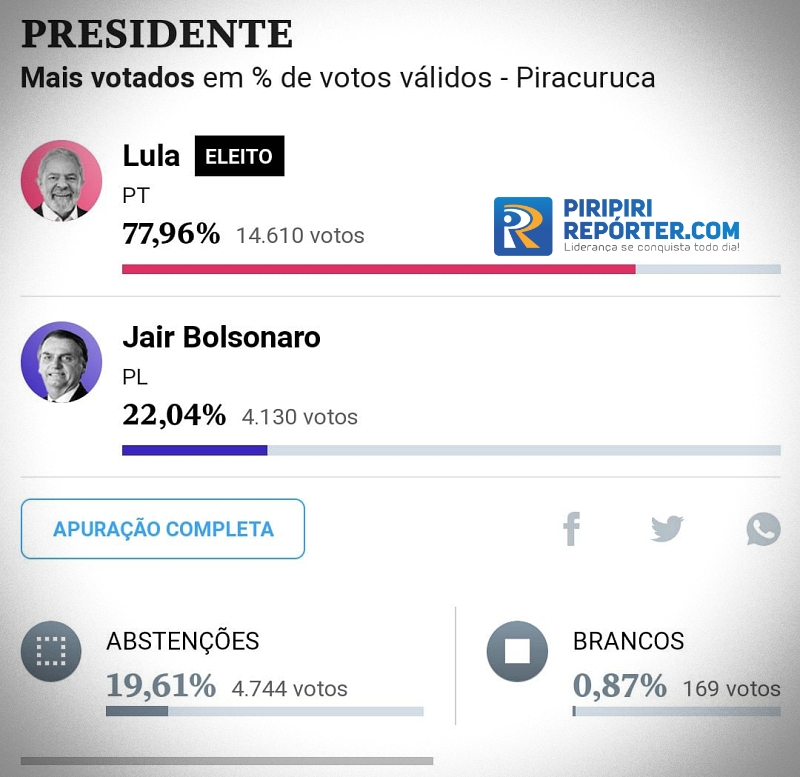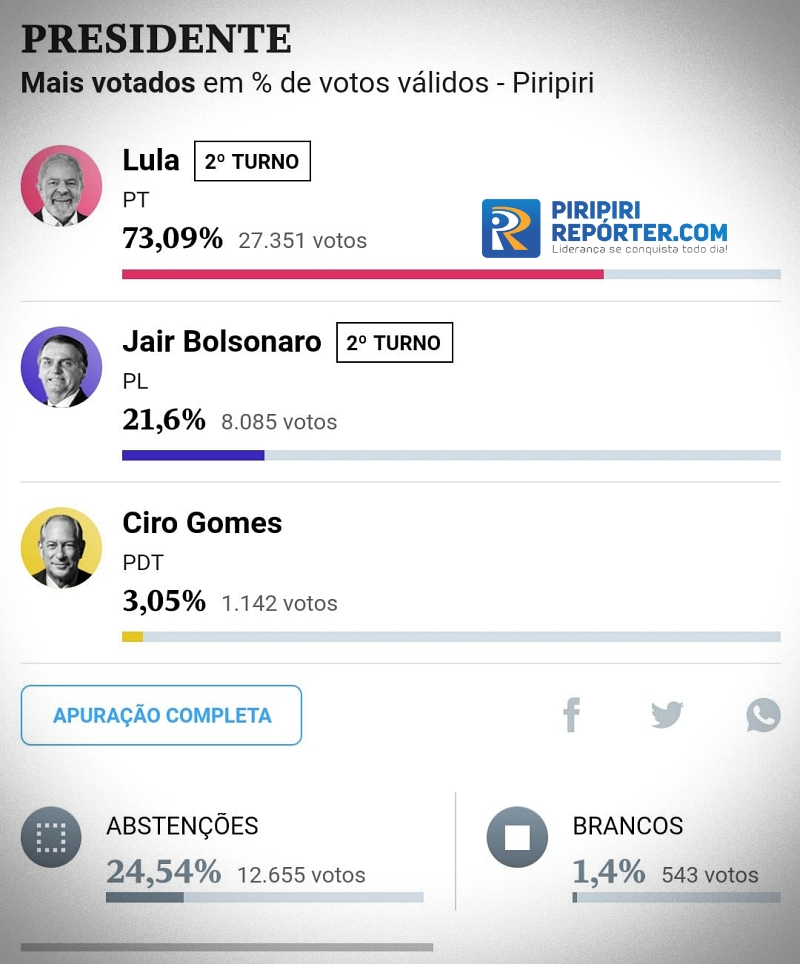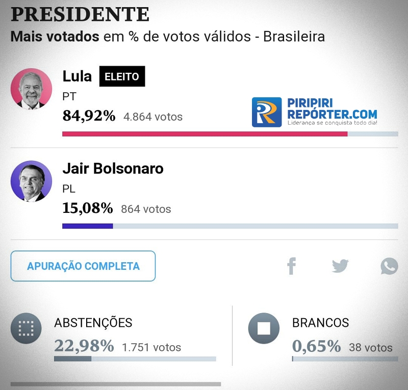 Em resumo, Lula confirmou a sua vitória em Piracuruca mas houve uma diminuição na diferença entre o candidato do PT e Jair Messias Bolsonaro. Segue as estatísticas: