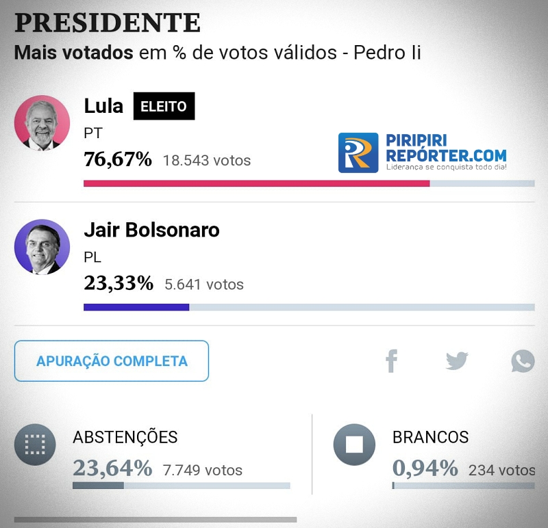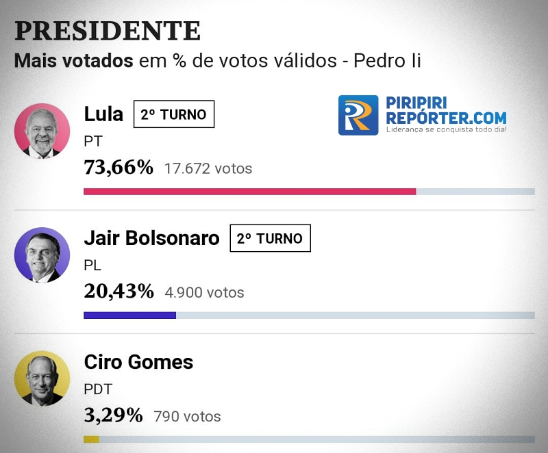 Em resumo, Lula confirmou a sua vitória em Pedro II e ainda aumentou a diferença entre o candidato Bolsonaro. Segue as estatísticas: