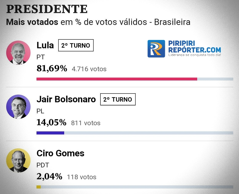 Em resumo, Lula confirmou a sua vitória em Piripiri, mas Jair Messias Bolsonaro diminuiu a diferença entre eles. No primeiro turno a diferença entre eles era de 19.266 votos válidos. Nesse segundo turno, a diferença caiu para 19.002 votos válidos.
