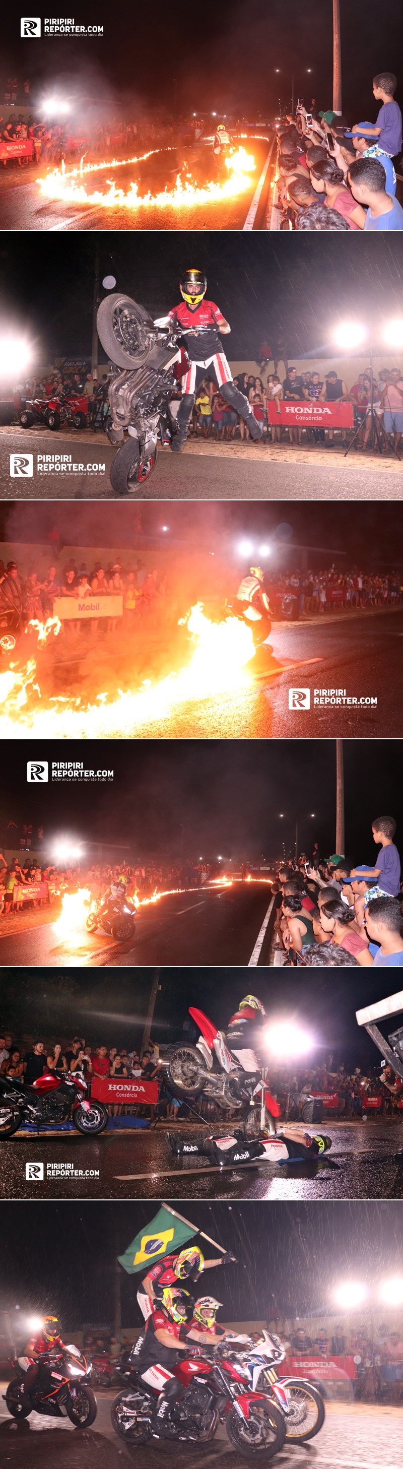 Com uma hora de duração, foi um verdadeiro espetáculo com direito a acrobacias, pirotecnia e efeitos especiais. A Parnauto Honda trouxe os pilotos.
