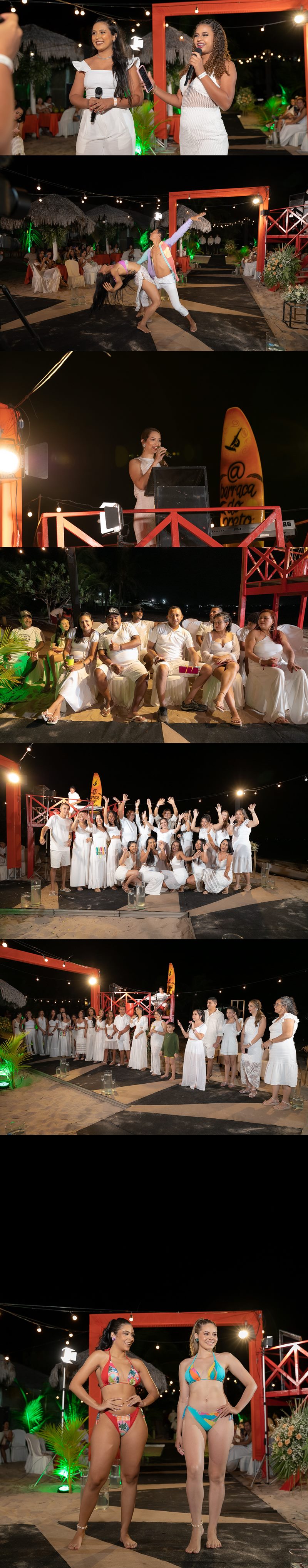 O casal de empreendedores Erineuda e Edimar levou funcionários da fábrica/loja, parceiros e outros convidados para o local do desfile. A estrutura foi montada na areia, a poucos metros do mar.