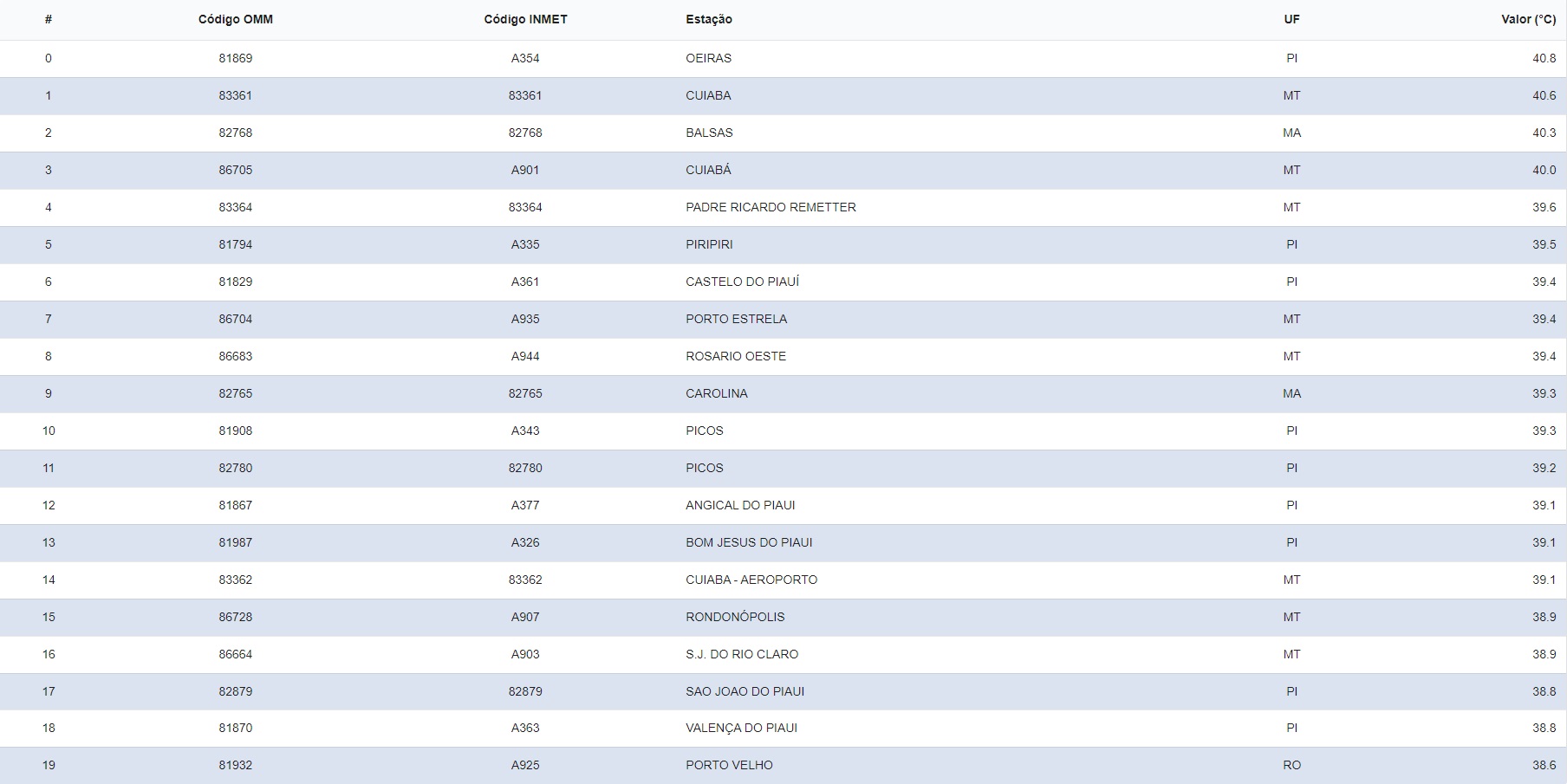 Oeiras registrou 40.8°C, Piripiri 39.5°C, Castelo do Piauí 39.4°C, Picos 39.3°C, Angical e Bom Jesus registraram 39.1°C, São João do Piauí e Valença registraram 38.8°C.