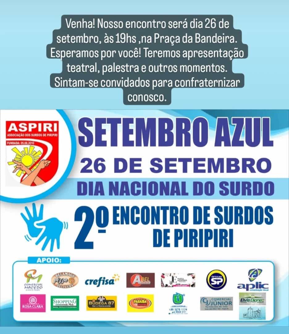 No dia 26 de setembro, segunda-feira, acontecerá, na Praça da Bandeira, o 2° encontro de surdos de Piripiri.