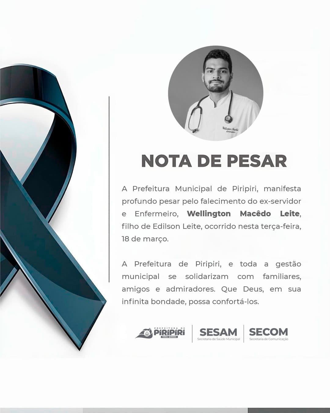 A Prefeitura Municipal de Piripiri manifestou profundo pesar pelo falecimento do ex-servidor e enfermeiro Wellington Macêdo Leite, ocorrido nesta terça-feira, 18 de março. Filho de Edilson Leite, Wellington estava em São Paulo, onde se especializava.