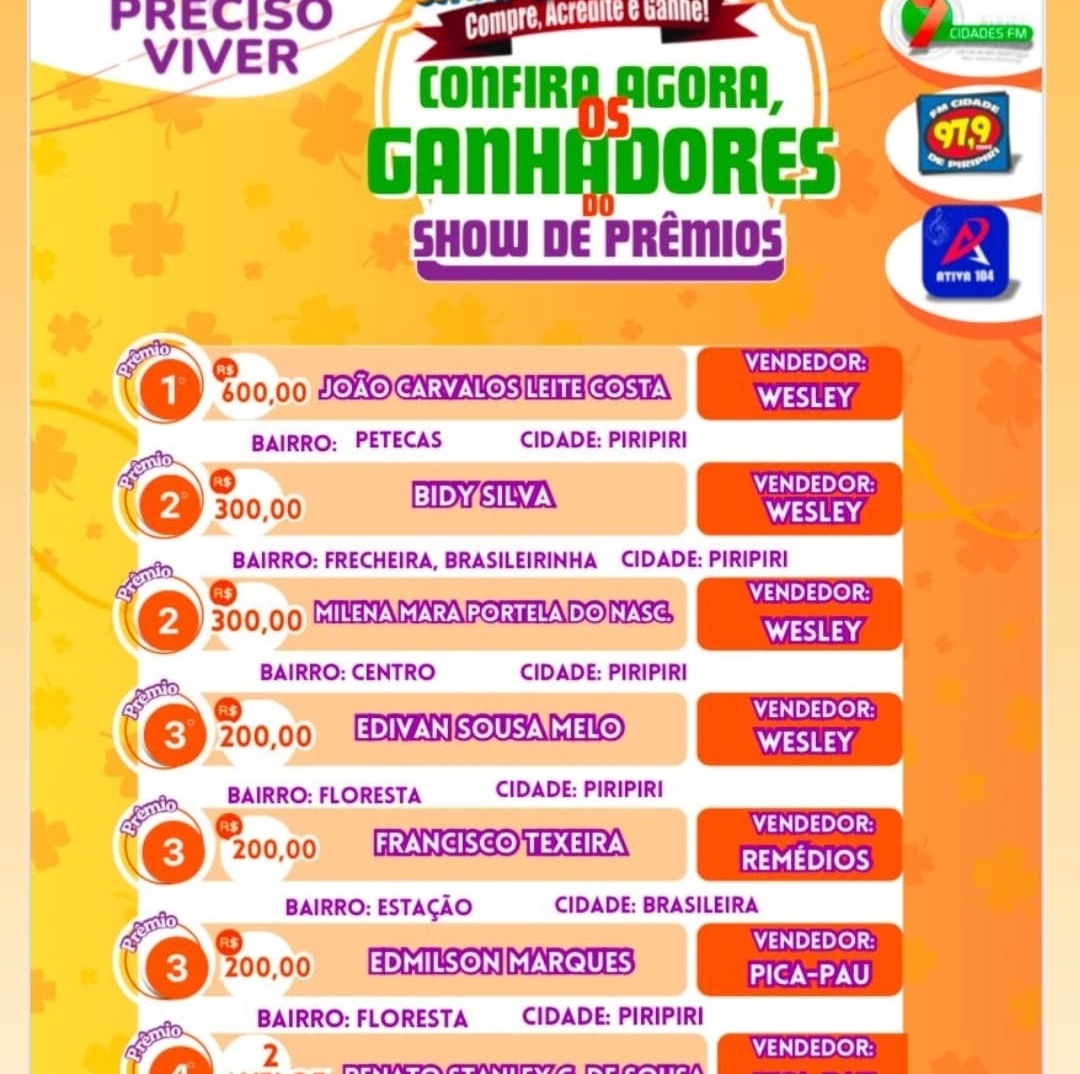 Neste domingo, 24 de dezembro, o Piripiri Show de Prêmios promete mais emoção com um novo sorteio. Os participantes poderão concorrer a 20 mil reais, além de três prêmios de mil reais e 10 giros da sorte no valor de 100 reais cada. A transmissão será realizada pela rádio FM Cidade e também estará disponível nas plataformas digitais, incluindo Facebook e YouTube do Piripiri Repórter.