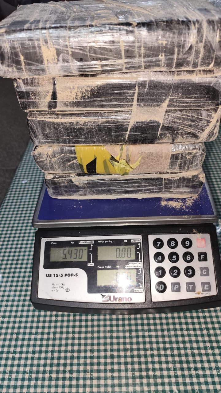 Ao ser feita a busca veicular, foi encontrado 05 tabletes de substância análoga a cocaína, totalizando 05 quilos e 430 gramas e diante do fato, foi dado voz de prisão indivíduos e feito a condução para a delegacia de polícia para que as medidas legais cabíveis fossem tomadas. Após consulta, foi constatado que um deles tinha mandado de prisão em aberto.