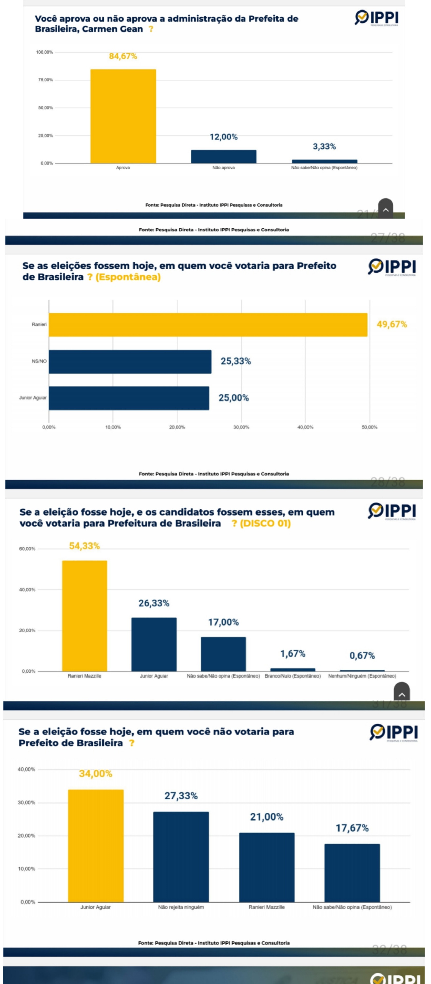 O objetivo da pesquisa foi captar a opinião dos cidadãos sobre as eleições municipais. Na pergunta espontânea sobre em quem votariam para prefeito de Brasileira, 49,67% dos entrevistados apontaram Ranieri Mazzille. 25,33% não sabem ou não opinaram. O candidato Júnior recebeu 25% das intenções de voto.