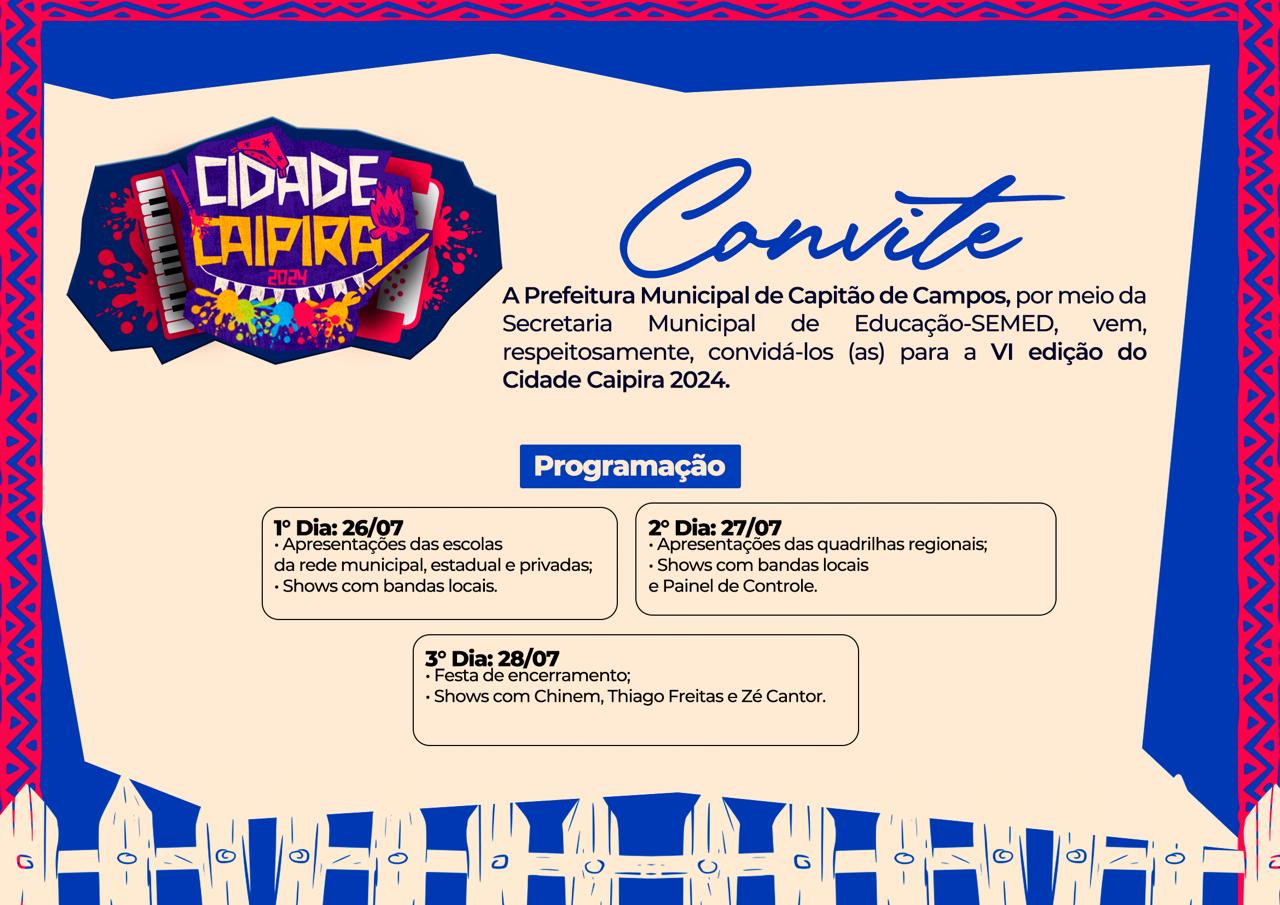 Acontece no município de Capitão de Campos mais uma edição do Cidade Caipira, evento alusivo que reúne danças, comidas típicas e shows músicas. Entre as atrações desta edição tem Zé Cantor, Thiago Freitas, Painel de Controle, Chinem e outras bandas.