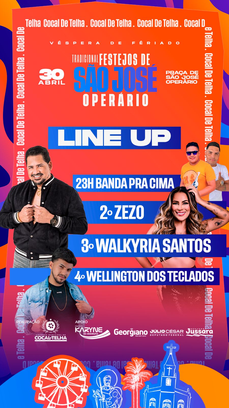 Este ano, os festejos contarão com a presença de grandes nomes da música, como Zezo Potiguar e Walkyria Santos, que serão as principais atrações da festa em praça pública, dia 30 de Abril.