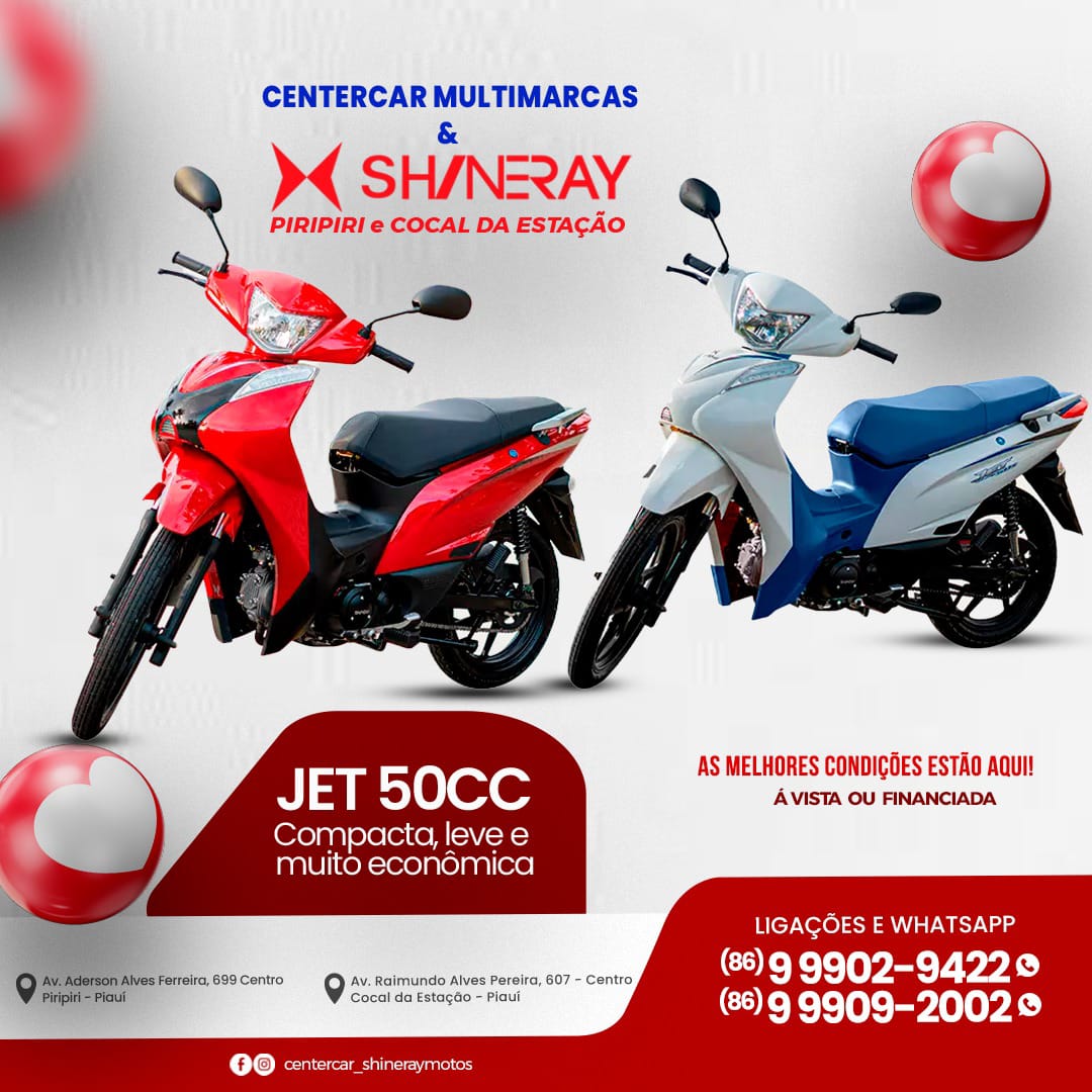 Conheça a variedade da Shineray Motos de Piripiri! Tem a JEF - 50, com design esportivo com acabamento impecável! Tem a Ray, 50 , com design morrer e elegante! Tem também a JET 40 cc, compacta, leve e muito econômica. E tem outros modelos que podem se encaixar com sua necessidade!