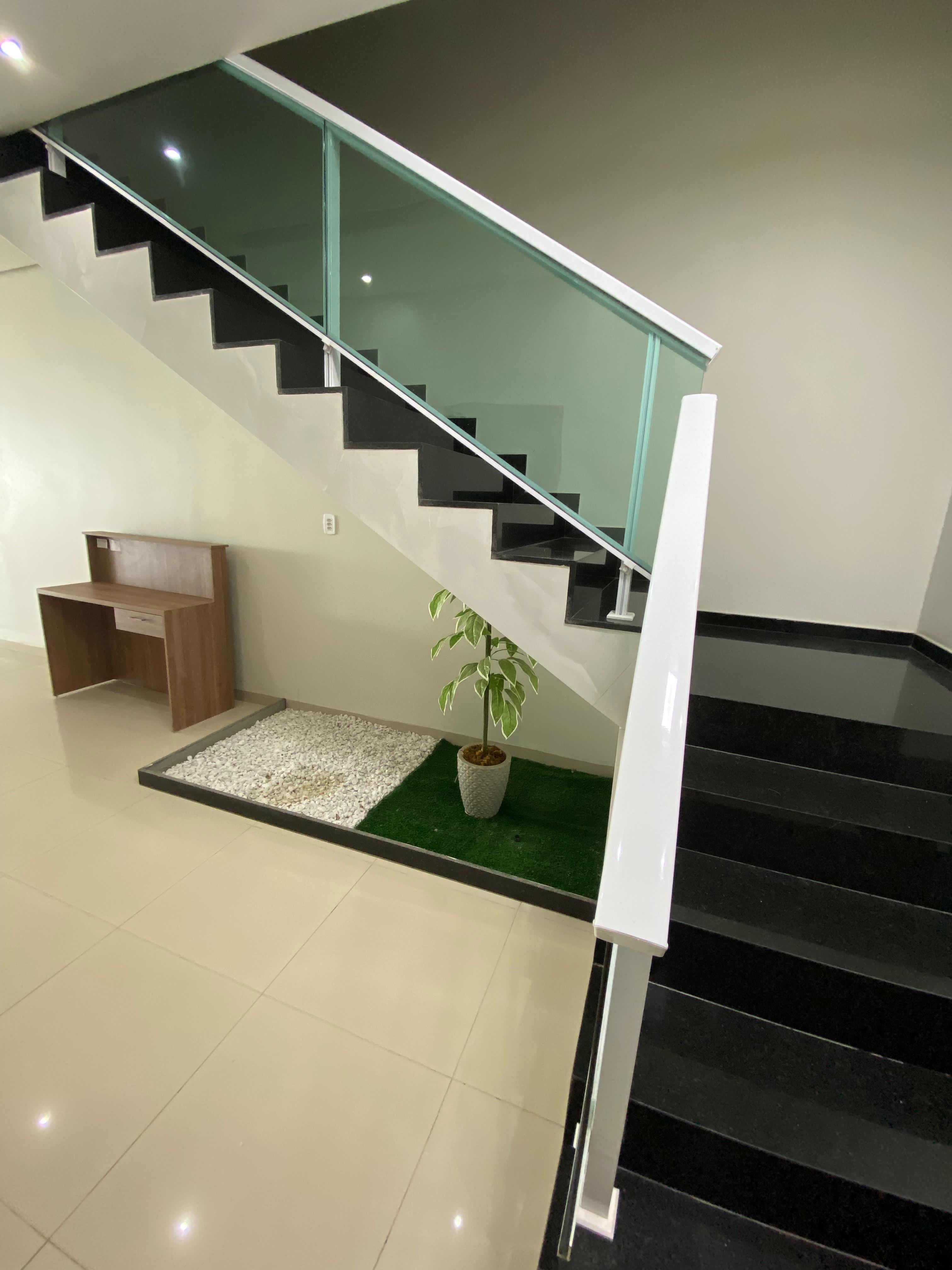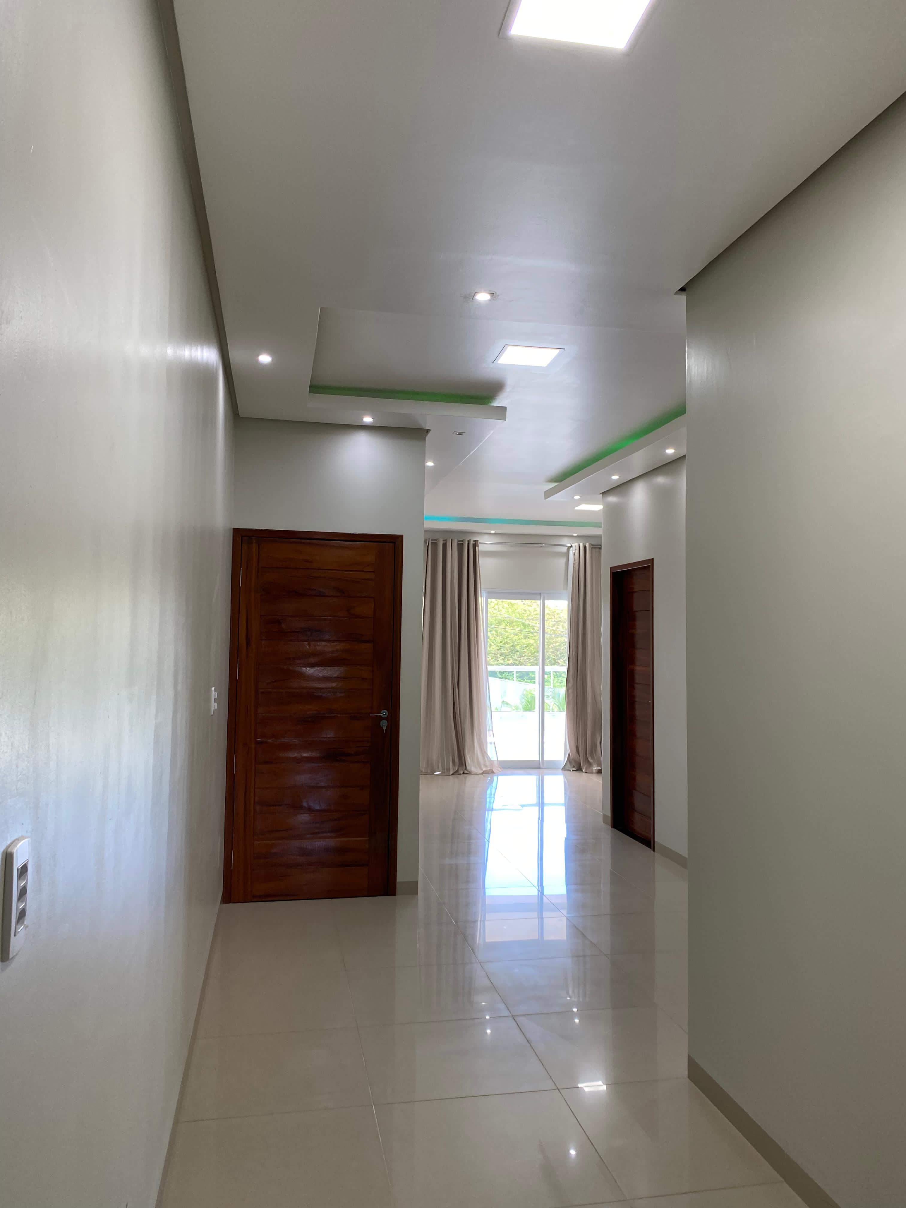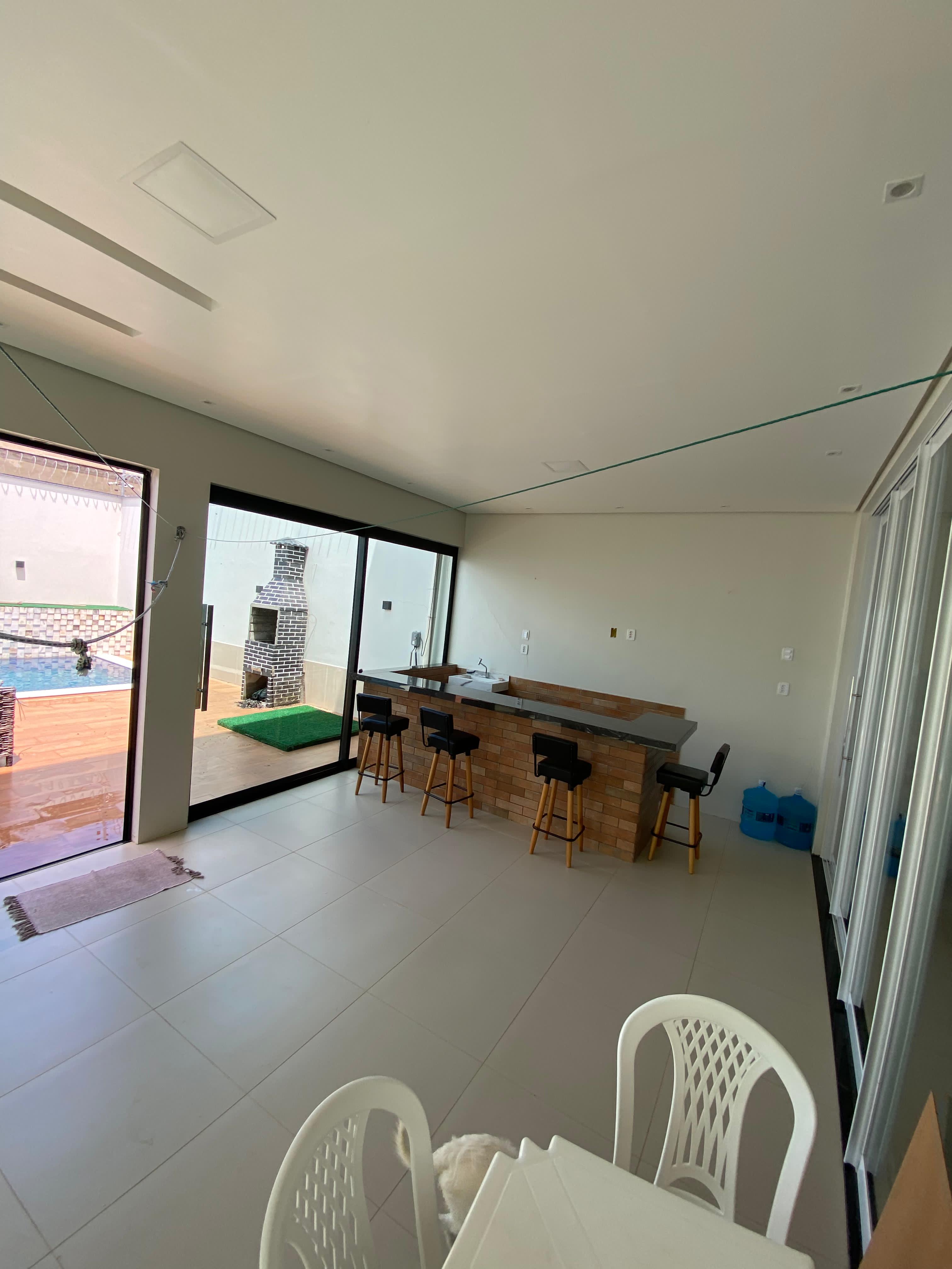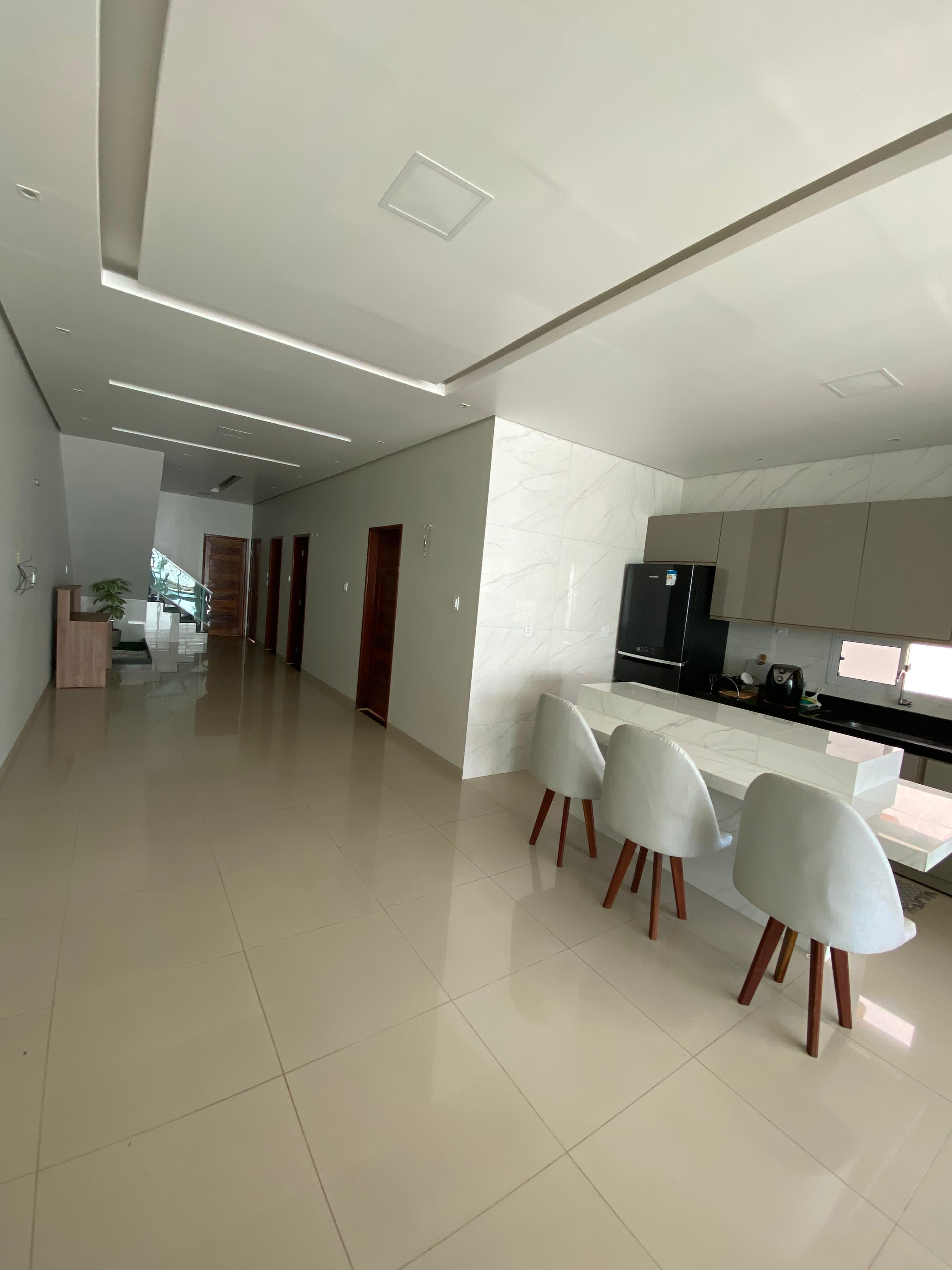 Casa duplex, seminova com apenas um ano de uso, contém 4 quartos, 1 suíte, 1 sala, 3 banheiros e uma sala de estar com cozinha. A casa contam também com uma área de lazer com piscina e banheiro, uma área de serviço e uma garagem para dois carros.