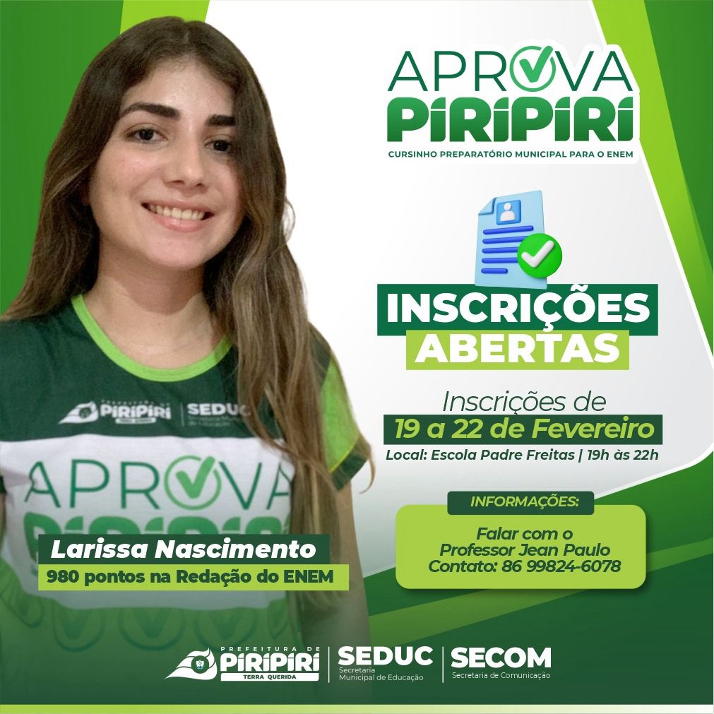 A Prefeitura Municipal de Piripiri, por meio da Secretaria Municipal de Educação (SEDUC), lançou edital do Processo Seletivo, de número 002/2024, para preenchimento de vagas do cursinho municipal Aprova Piripiri. Estão sendo ofertadas 120 vagas para aquelas pessoas interessadas em realizar o Exame Nacional de Ensino Médio (ENEM) de 2024.