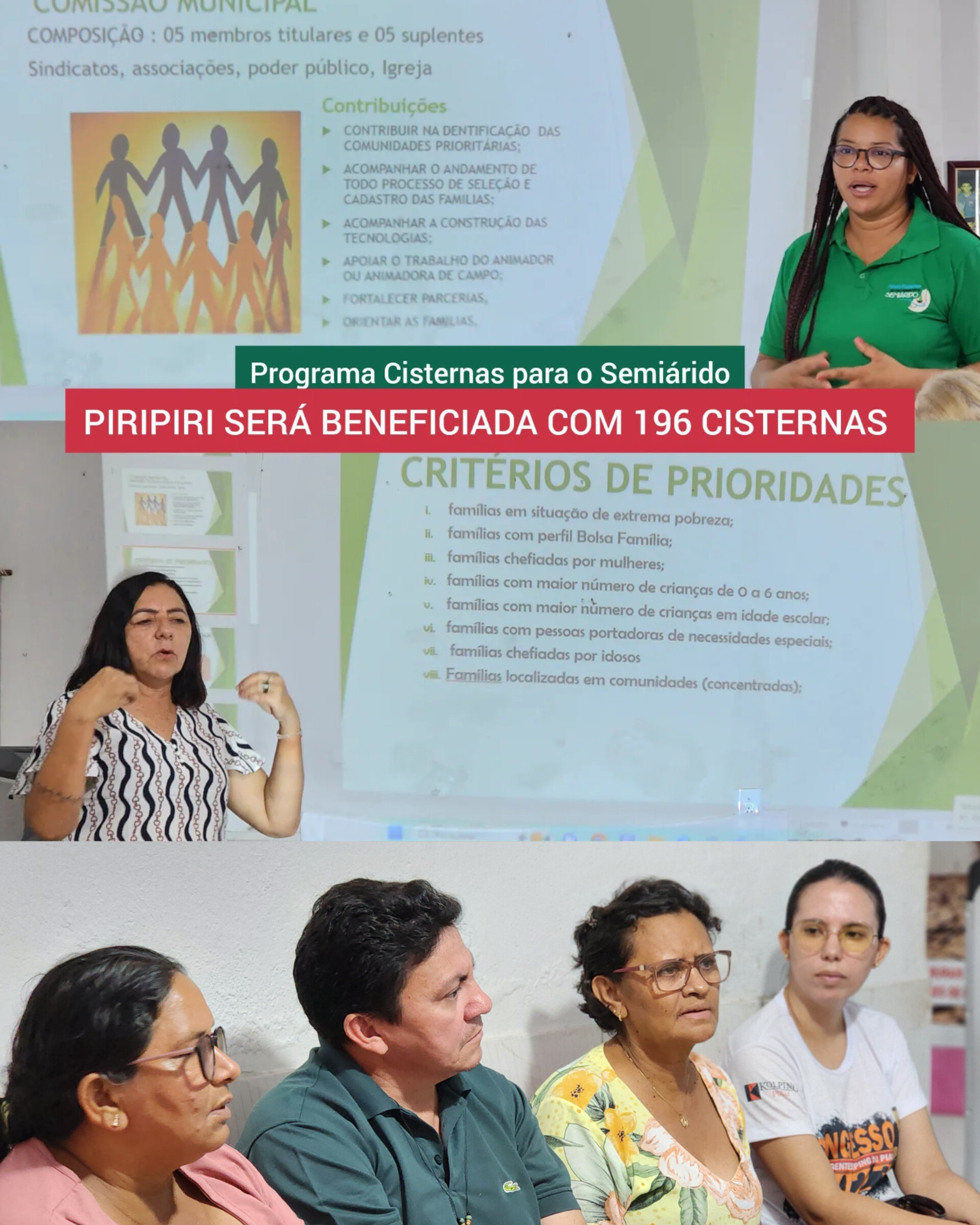 As cisternas são reservatórios que captam e armazenam a água da chuva, que pode ser usada para consumo humano ou para produção de alimentos. “As cisternas são uma tecnologia social que permite às famílias terem autonomia e segurança hídrica, além de melhorarem sua alimentação e sua renda”, afirmou Eunice, que destacou algumas comunidades que sofrem bastante tanto com a falta de água como também comunidades que tem poço, mas a água não tem qualidade para o consumo.