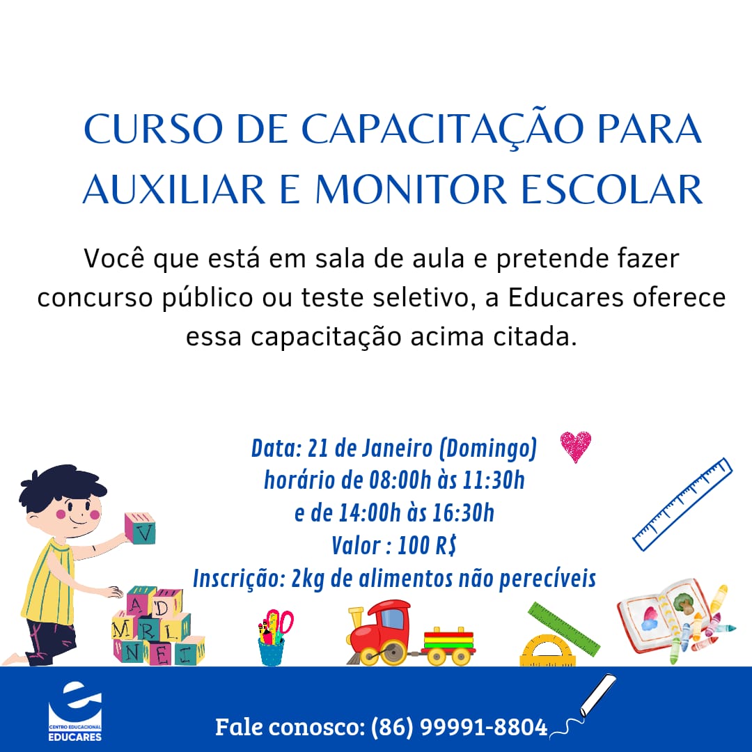 A Educares, juntamente com faculdades parceiras, está realizando curso de capacitação para auxiliar e monitor escolar. A inscrição é 2kg de alimento não perecível.