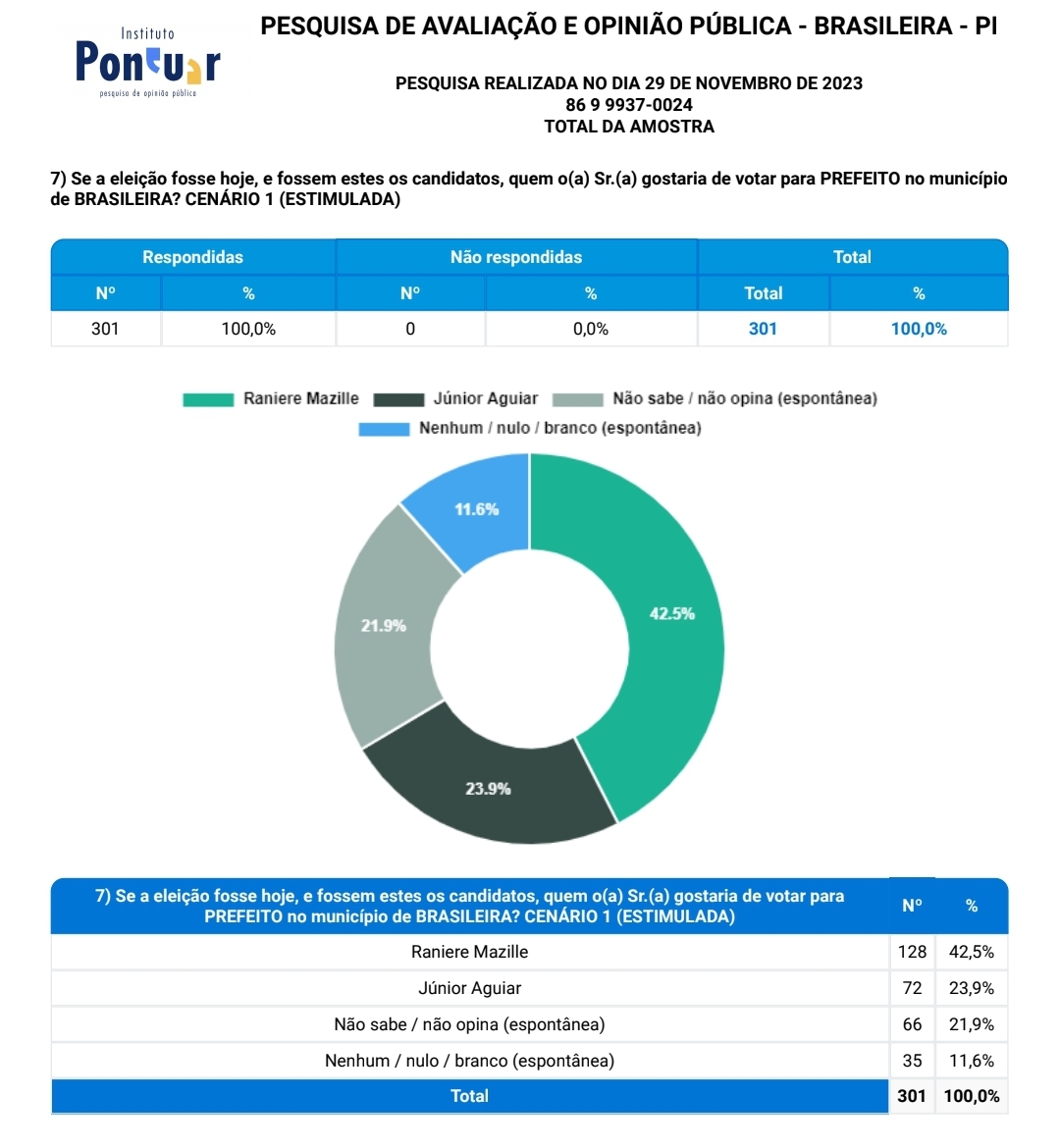 Pesquisa realizada no dia 29 de novembro pelo Instituto Pontuar (CNPJ nº 02.702.085/0001-86) no município de Brasileira-PI, com amostra de 301 pessoas, incluindo zona urbana e rural, aponta o pré-candidato a prefeito de Brasileira Raniere Mazzille, apoiado pela atual prefeita Dra. Carmen Gean, com grande vantagem sobre o candidato da oposição, Júnior Aguiar, presidente da Câmara Municipal.