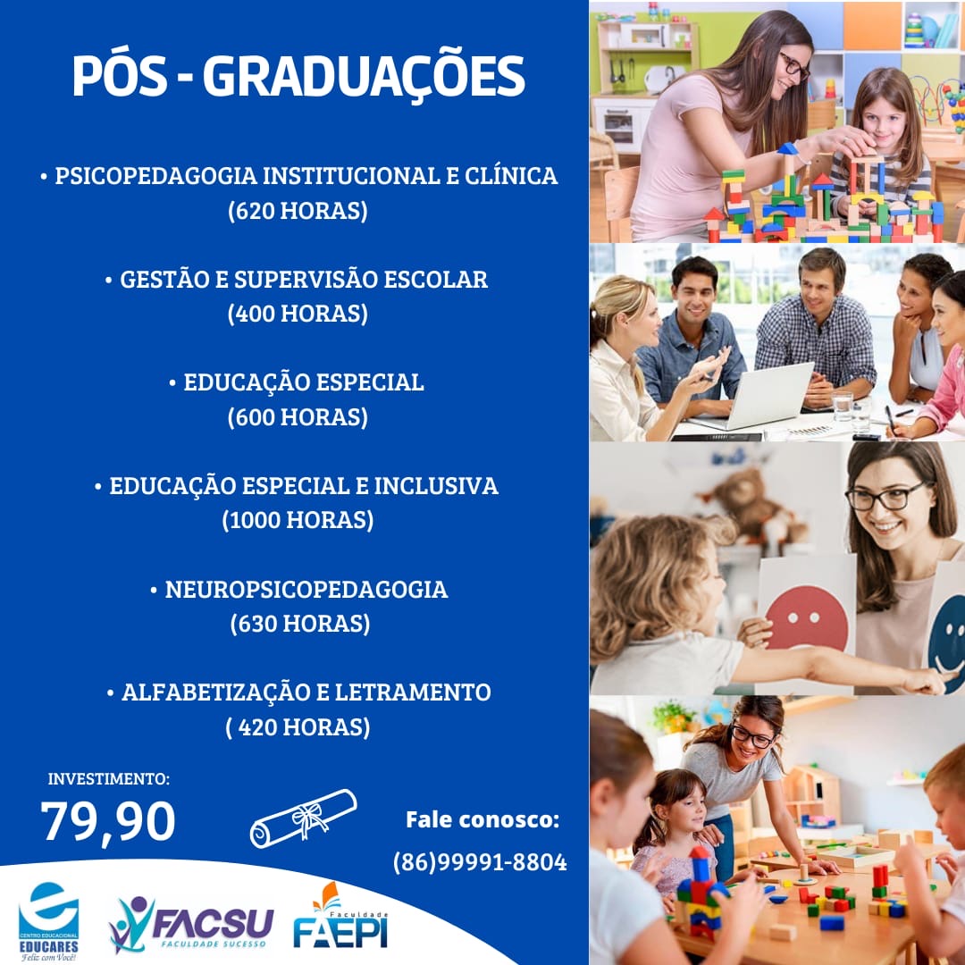 Além de tudo isso, a Educares e faculdades parceiras oferecem diversas opções em cursos de Pós-graduação com investimento de apenas R$79,90. Entre em contato agora mesmo pelo 86 99991-8804.
