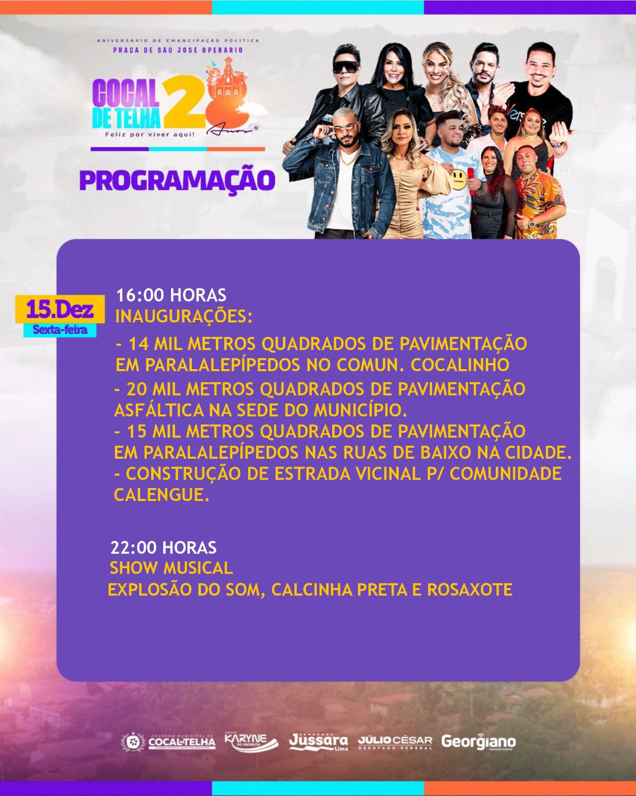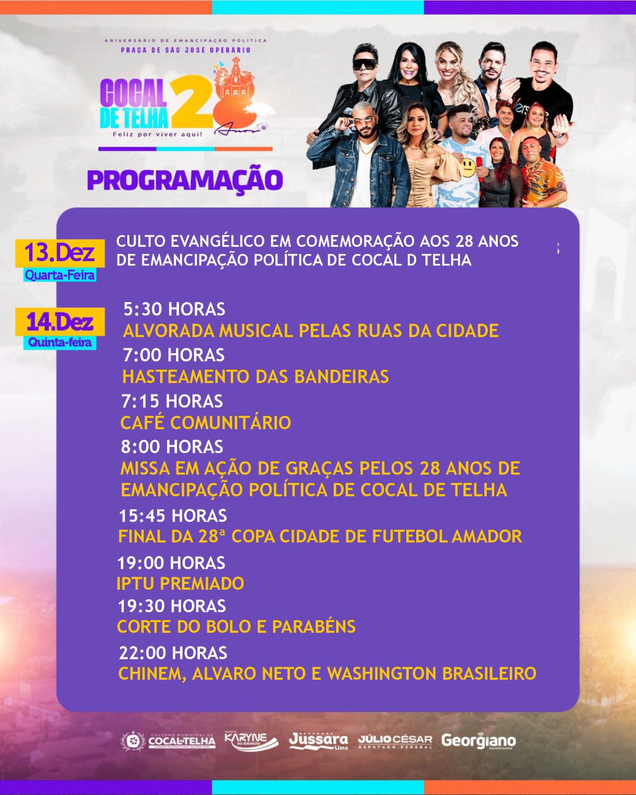 A cidade de Cocal de Telha completa, nesta quinta-feira (14) seus 28 anos de Emancipação Política. Na programação, momentos religiosos, solenidade cívica, inaugurações e festas! Entre as atrações tem Calcinha Preta e Washington Brasileiro. Veja a programação:
