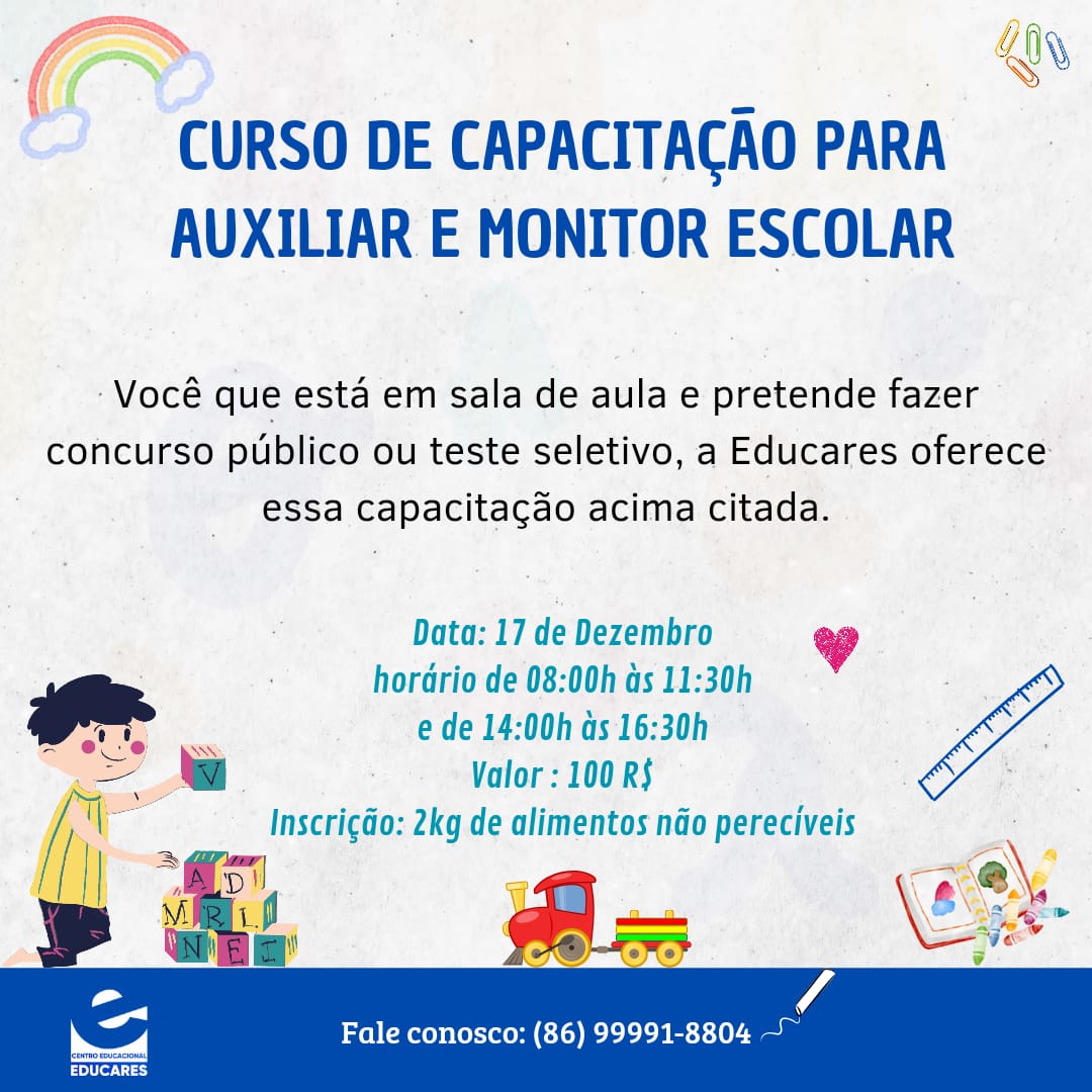 A Educares juntamente com faculdades parceiras também está realizando curso de capacitação para Auxiliar e Monitor Escolar, que acontecerá no dia 17 de Dezembro pela manhã das 08:00h às 11:30h e à tarde das 14:00h às 16:3h. O curso custa apenas R$ 100,00 e a inscrição apenas 2KG de alimentos não perecíveis.