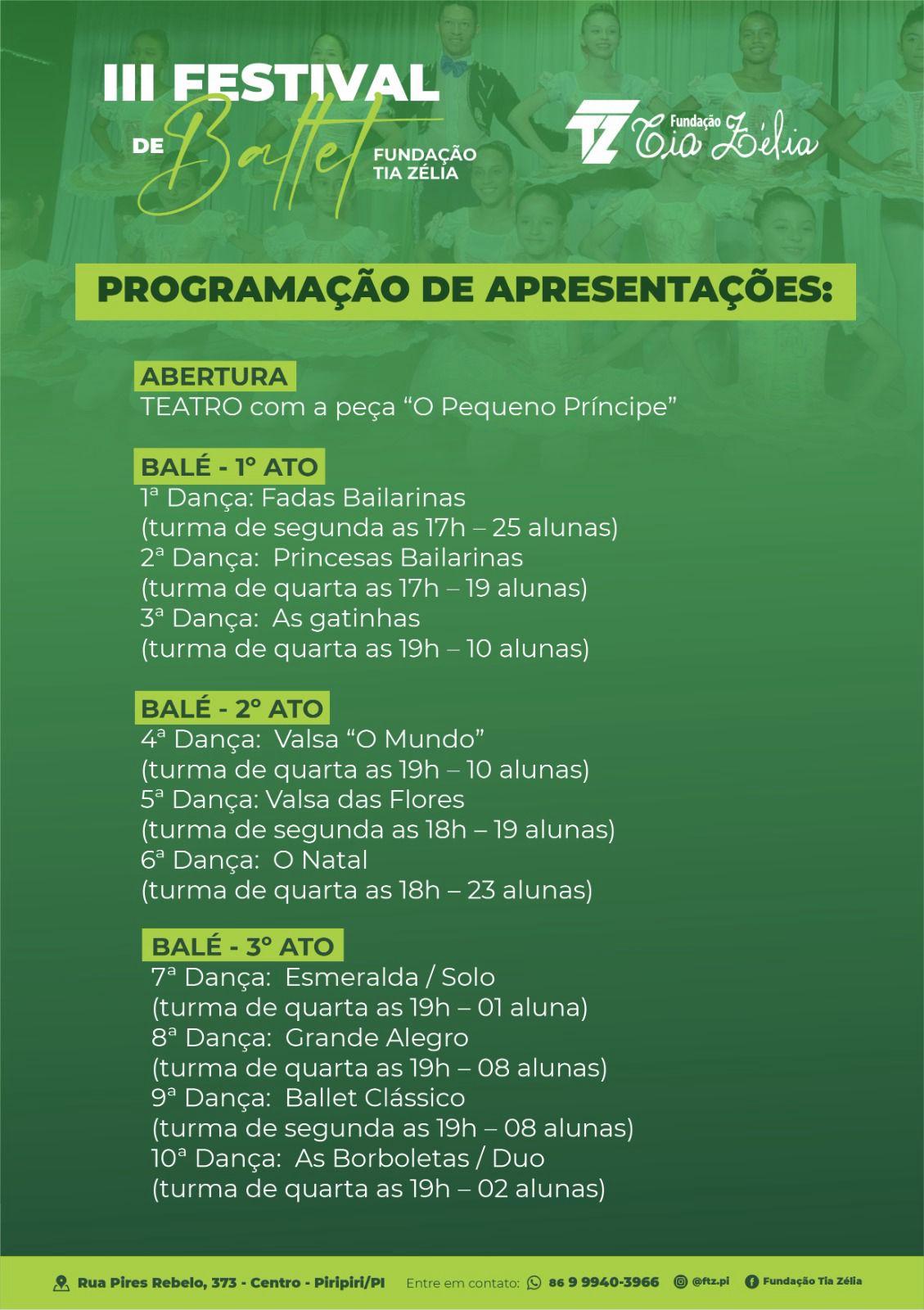 Vá prestigiar esse espetáculo na Rua Pires Rebelo, número 373, no Centro de Piripiri, próximo à Igreja Matriz.