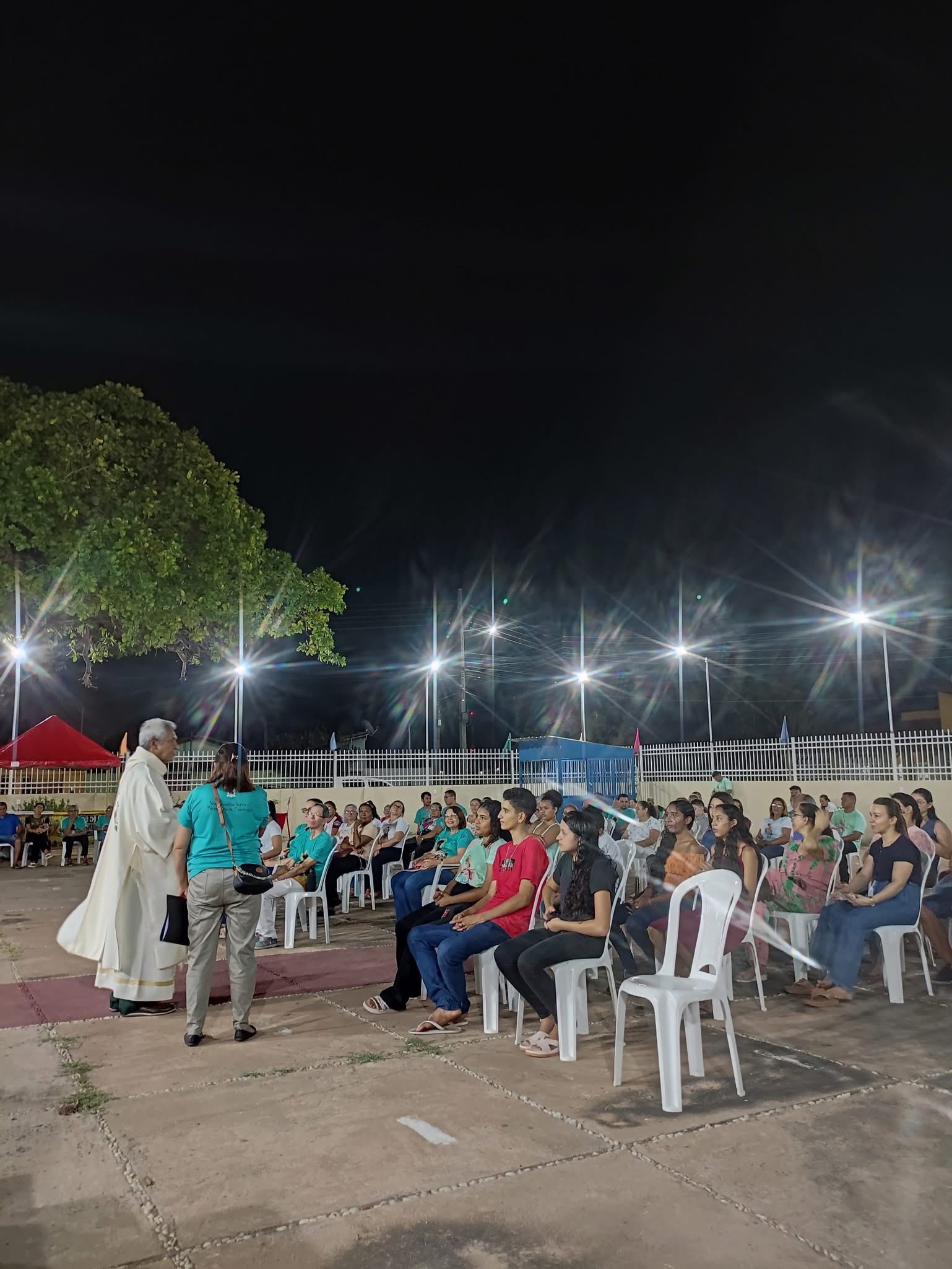 A abertura foi marcada pelo tradicional hasteamento do mastro da bandeira, e um momento de fé e devoção que reuniu a comunidade local para celebrar o início dos festejos. Durante a Celebração da Palavra, os fiéis puderam ouvir o testemunho do Diácono Gonzaga, que falou sobre os chamados de Deus e destacou que “missão boa é missão difícil”.
