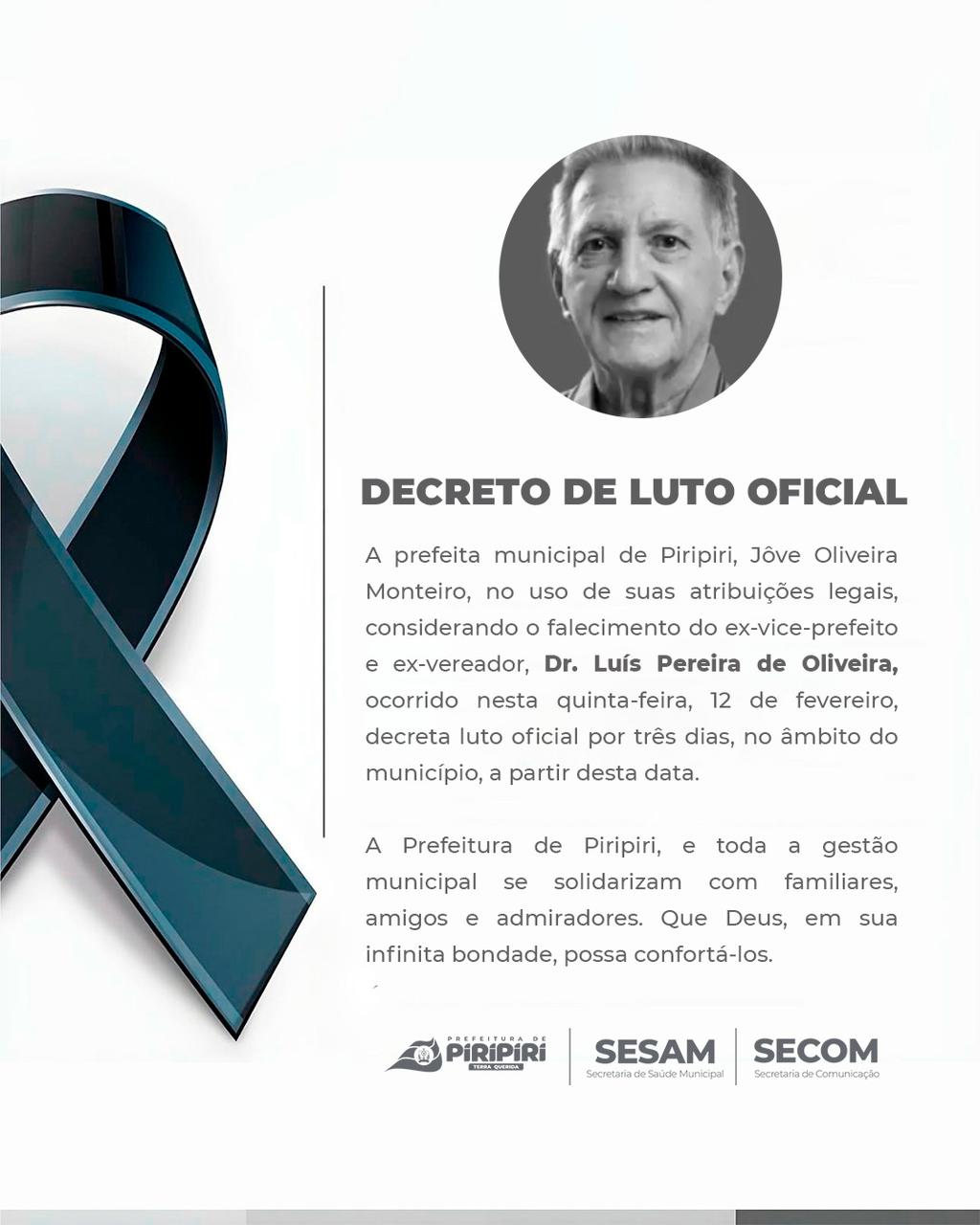 O município de Piripiri em luto nesta quinta-feira (12), com a confirmação do falecimento do médico e  Dr. Luiz Pereira de Oliveira, conhecido pela atuação nas áreas de saúde e da política local.