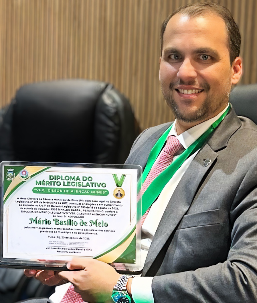 O advogado Mário Basílio, candidato ao Quinto Constitucional, recebeu na noite desta quarta-feira (20) a Medalha do Mérito Legislativo Vereador Gilson Nunes, durante sessão solene realizada na Câmara Municipal de Picos. A homenagem foi proposta pelo vereador Francisco das Chagas (Chaguinha) e integrou a programação comemorativa do Dia do Advogado, celebrado em 11 de agosto.
