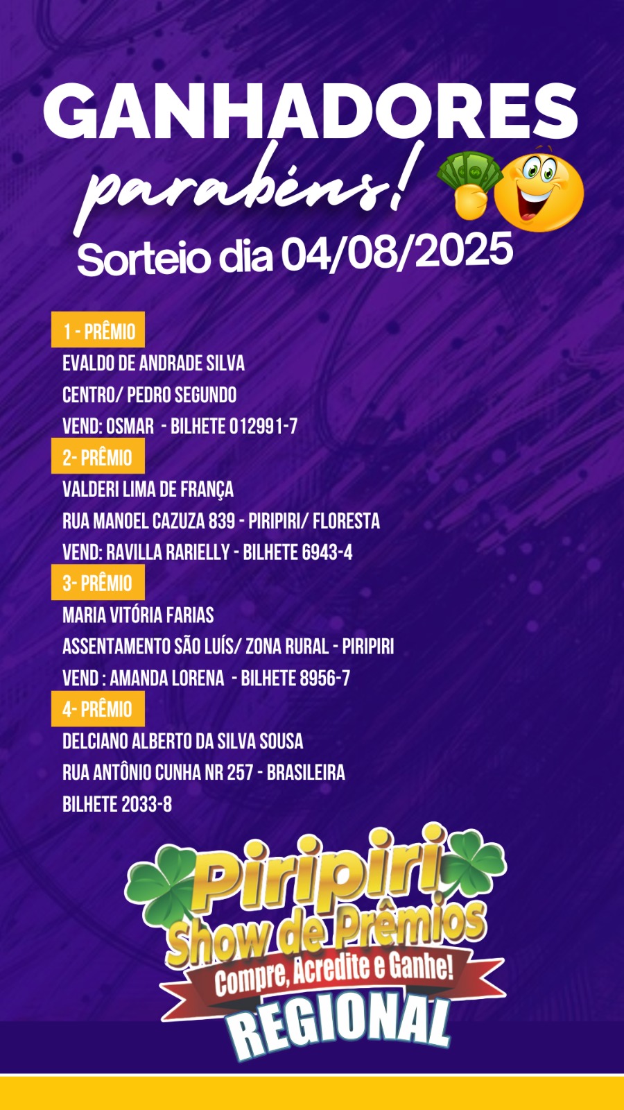 Para participar e concorrer aos próximos sorteios, os interessados podem procurar um vendedor na região ou entrar em contato diretamente pelo WhatsApp através do link: https://wa.me/5586999253846 AQUI .
